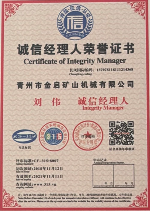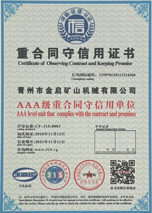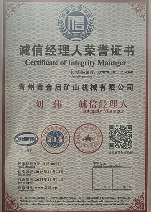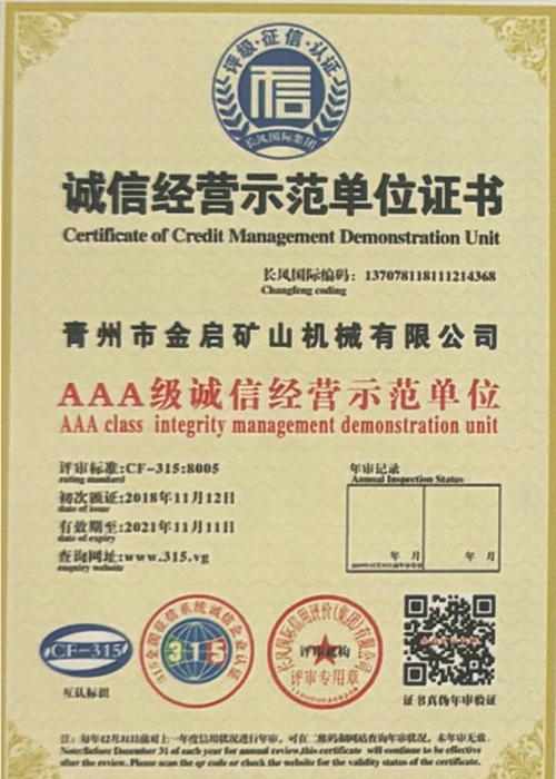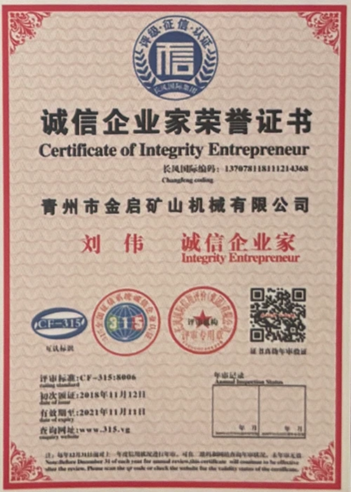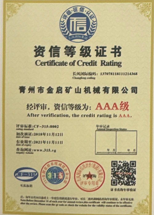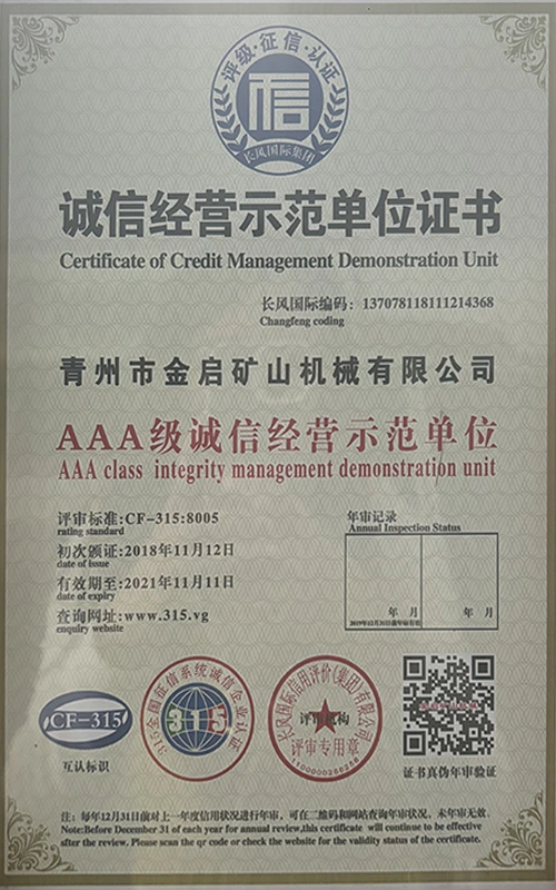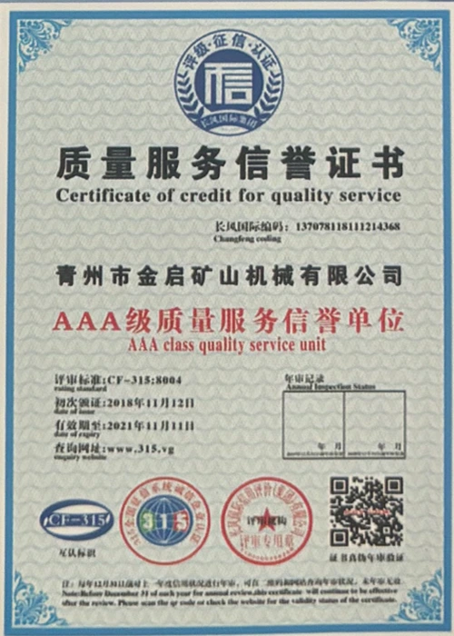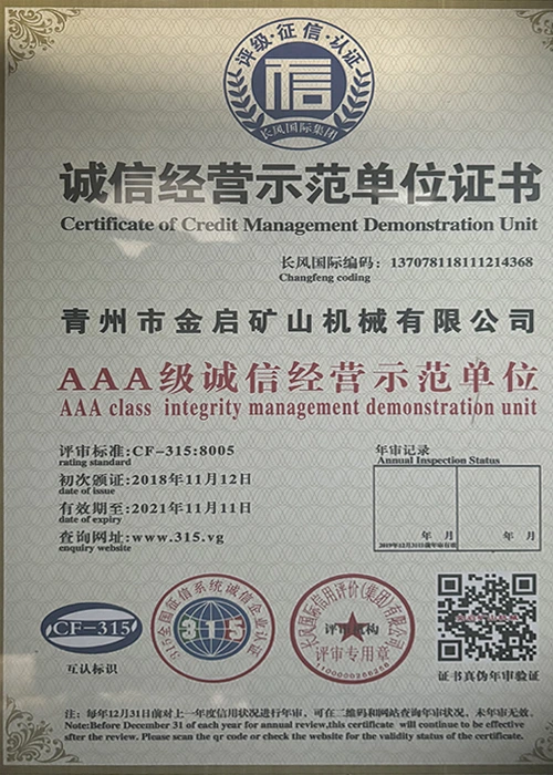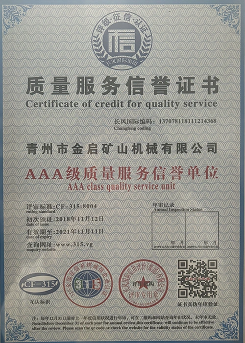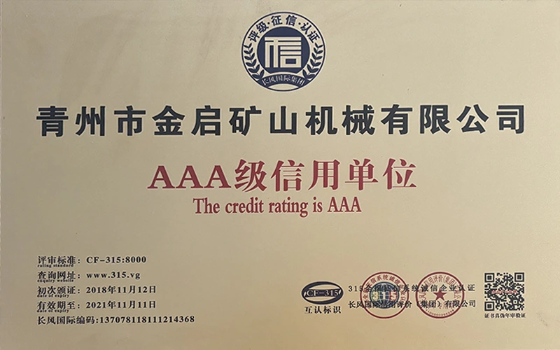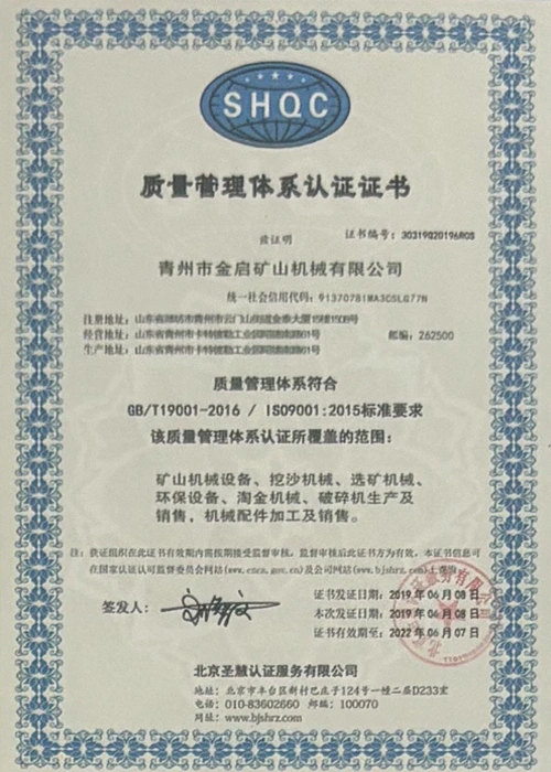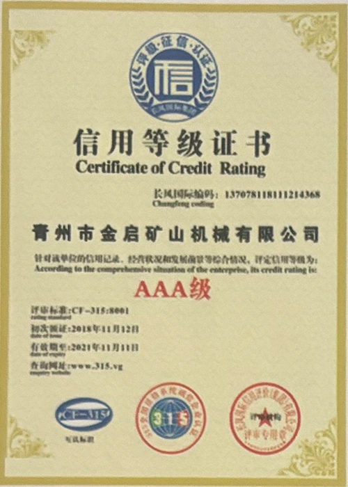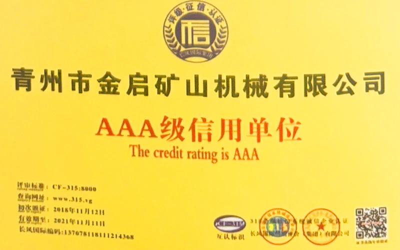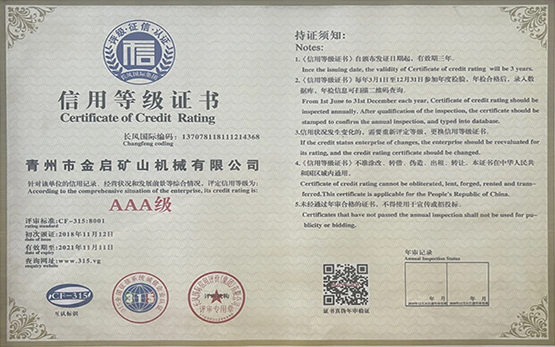 Kwa miaka ya uzoefu wa kina katika tasnia, kutegemea udhibiti madhubuti wa ubora na uvumbuzi endelevu wa kiteknolojia, kampuni imepata sifa kadhaa za mamlaka, vyeti na vyeti vya hataza, ikiwa ni pamoja na udhibitisho wa mfumo wa usimamizi wa ubora wa ISO, uthibitishaji wa usalama wa bidhaa za madini, pamoja na hati miliki nyingi za uvumbuzi na ruhusu uboreshaji wa muundo wa matumizi na uboreshaji wa muundo wa teknolojia ya uboreshaji. nguvu ya kiufundi na dhamana ya uzalishaji inayolingana.